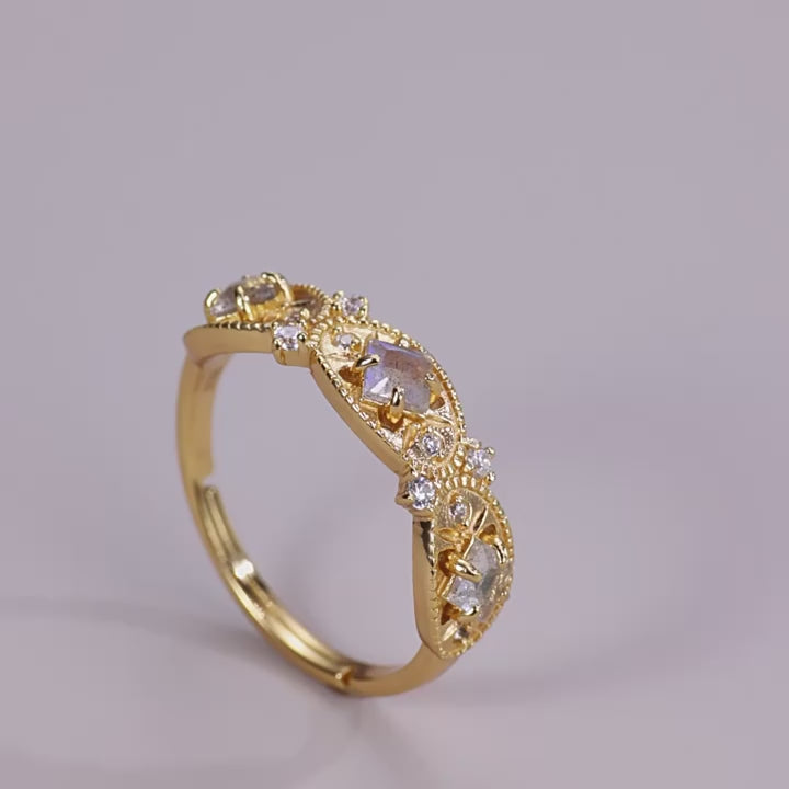 Light luxury carved hollow natural elongated stone ring S925 silver plated 10K gold ring
